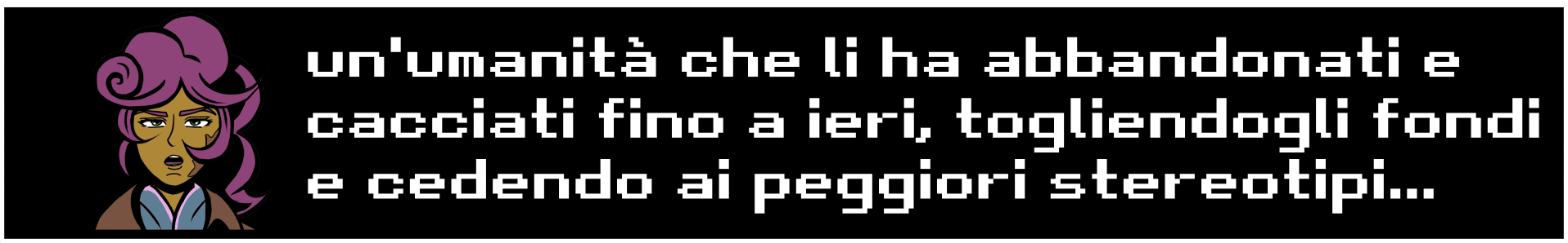 "...ecco sì anche quello" chiude la Locandiera. "In sostanza" riprende l'altra "dobbiamo fare il lavoro sporco per salvare le loro chiappe dopo che hanno ostacolato in tutti i modi le persone che, già discriminate e oppresse nella vecchia Terra, hanno lavorato al sogno di una vita più equa e lontana dalle logiche che stavano condannando il pianeta e le specie viventi. Niente di nuovo da parte della vecchia Terra." Non dice cose stupide nonostante il caratteraccio, in fondo, forse non è sempre stata così? Ma a parte questo, cosa c'entra il mech? Jungleland sbuffa.
